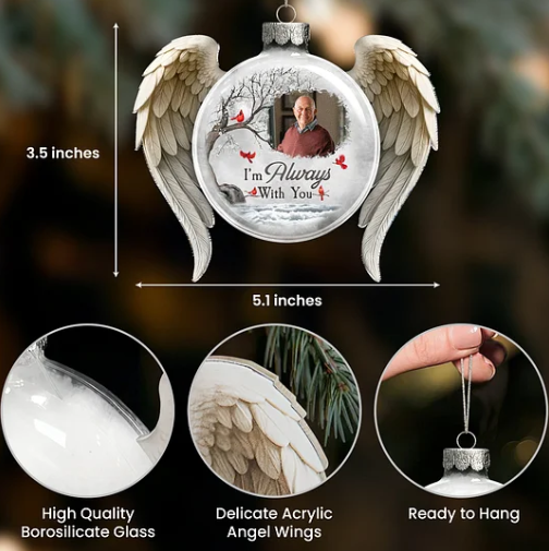 Embrace precious memories with our Glass Flat Ball Ornament, elegantly titled 'Christmas Ornament I'm Always With You'. Adorn your Christmas tree with a personalized keepsake that pays homage to a loved one. With a custom photo, this very special keepsake radiates sentimental appeal, serving as a cherished memory of a family member or close friend that's always with you during the festive season. It's an ideal gift perfect for Christmas and memorial occasions, making it a heartfelt way to express your love and remembrance.