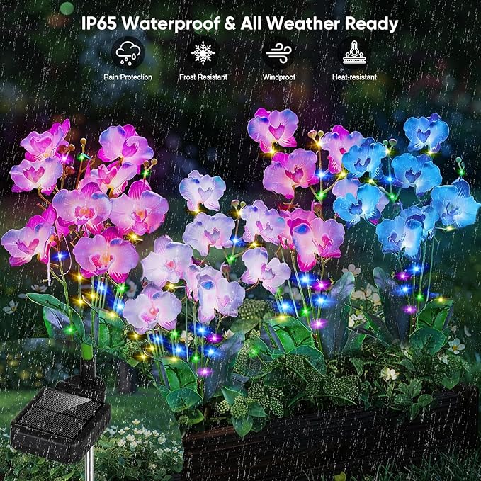 Weather-Resistant Construction: Made from high-quality, weather-resistant materials, our solar orchid lights are designed to withstand the elements. They are perfect for year-round use, enduring rain, snow, and sun without fading or losing their charm.