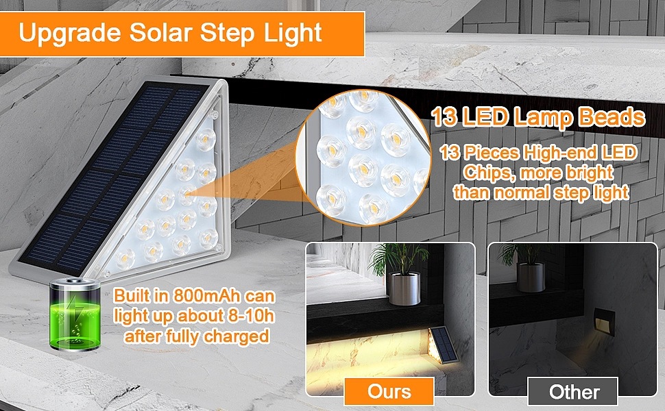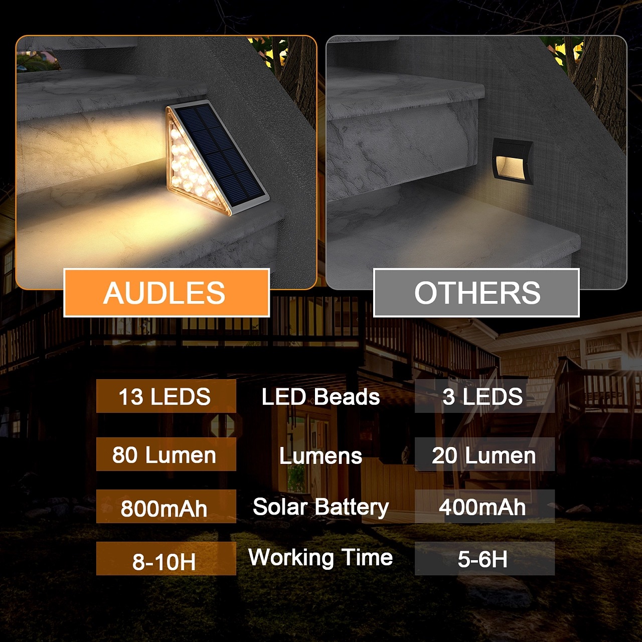 Don't settle for ordinary outdoor step lighting. The AuraTorch Step Lights have thirteen 80 LumensLEDs and a 800mAh battery to not only shine bright on every step but to ensure they stay on for 8 hours all throughout the nighttime without the need for any external electricity or wiring.