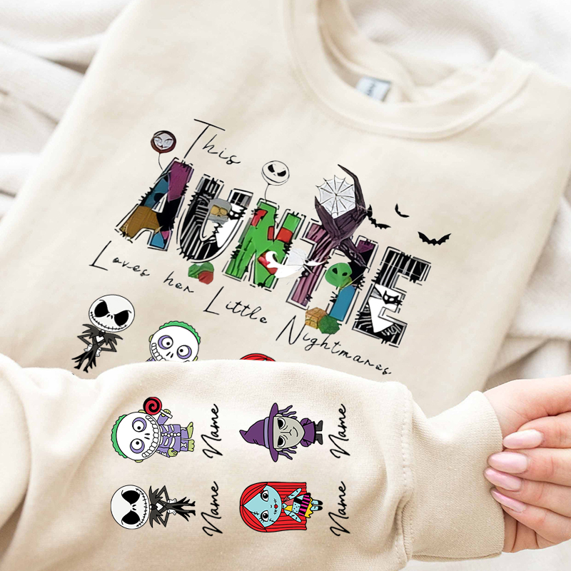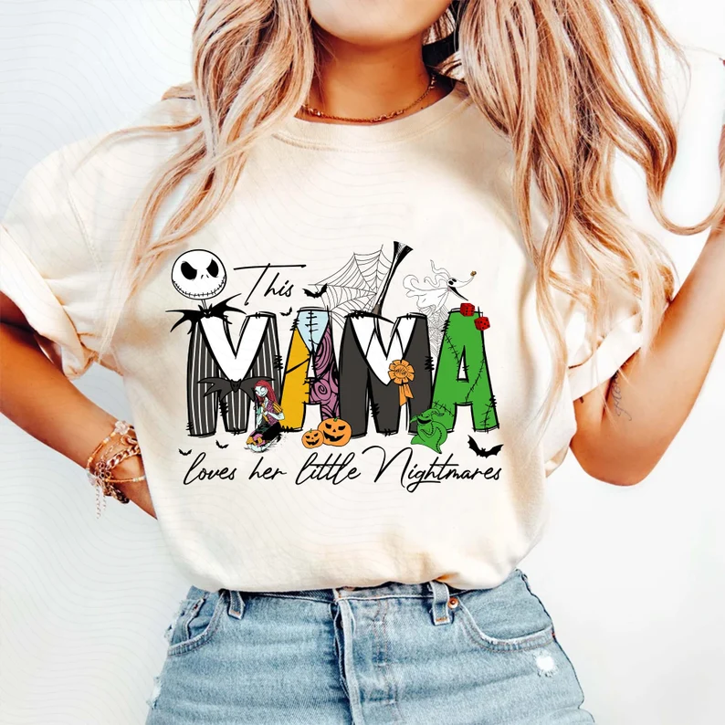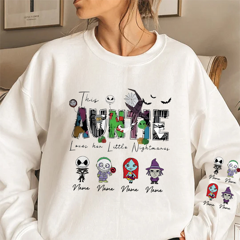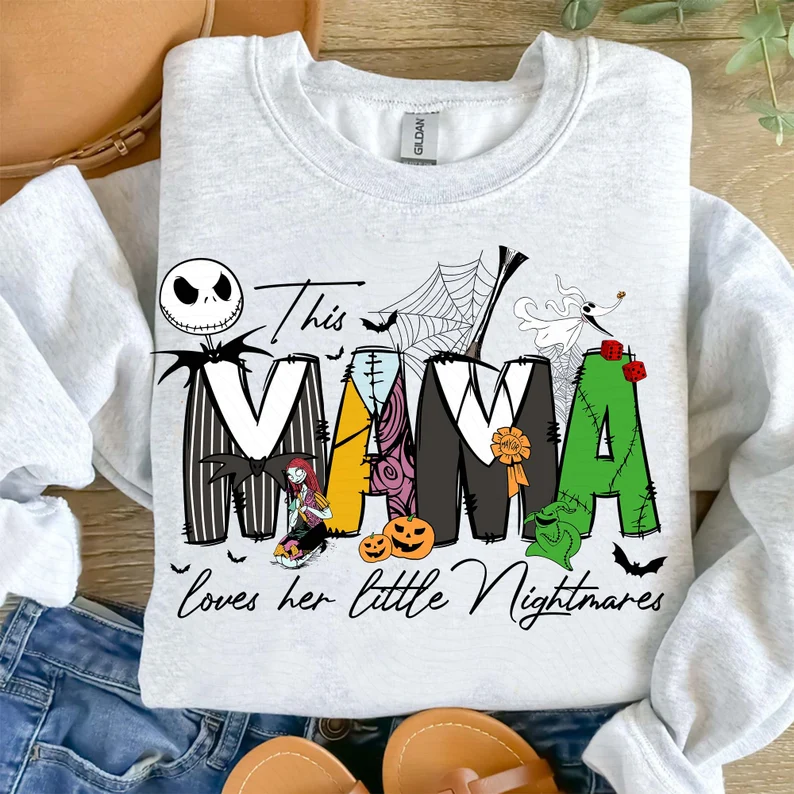 👻 Each sweatshirt features the phrase 'This Mama loves her little Nightmares' with unique Halloween-themed letters and your choice of adorable spooky characters (inspired by Nightmare Before Christmas style). You can personalize it with up to 6 names, making it a perfect gift from kids or grandkids.