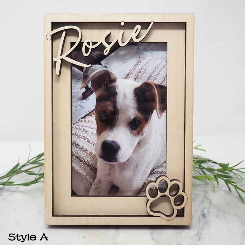 This personalized dog photo frame makes a great gift for dog lovers. Pet's name is laser cut from solid wood with 3D effect.